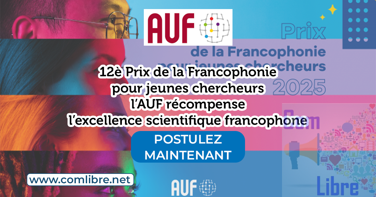 L’Agence Universitaire de la Francophonie (AUF) annonce le lancement de la 12ᵉ édition du Prix de la Francophonie pour jeunes chercheurs. Ce prix biennal vise à reconnaître et à promouvoir les travaux de recherche de jeunes scientifiques francophones dans deux domaines : les Sciences et Technologies et les Sciences humaines et sociales.
