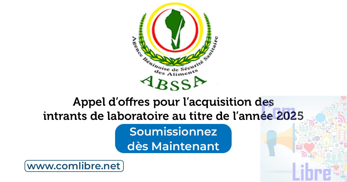 L’Agence Béninoise de Sécurité Sanitaire des Aliments (ABSSA) sollicite des offres sous pli fermé de la part de candidats éligible et répondant aux qualifications requises pour livrer des intrants de laboratoire (standards réactifs, solvants, verreries, consommables, milieux de culture, souches et échantillons certifiés au titre de l’année 2025 en un lot unique, Les variantes ne seront pas en considération.
