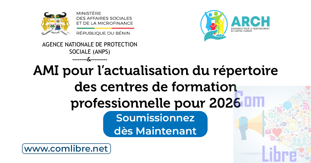 Dans le cadre de l’exécution de son Plan de Travail Annuel (PTA) 2026, l’Agence Nationale de Protection Sociale (ANPS), sous la tutelle du Ministère des Affaires Sociales et de la Microfinance, a ouvert un appel à manifestation d’intérêt stratégique. Cette initiative vise à mettre à jour et à élargir le répertoire des centres publics et privés agréés chargés d’assurer le volet formation du projet ARCH (Assurance pour le Renforcement du Capital Humain).