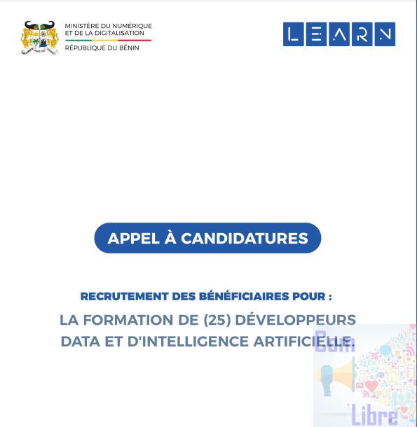 Dans le cadre de la mise en œuvre du partenariat avec SMART AFRICA sur le programme SMART AFRICA DIGITAL ACADEMY, le Ministère du Numérique et de la Digitalisation informe le public de l’ouverture des inscriptions pour le recrutement des bénéficiaires pour la formation de vingt-cinq (25) développeurs data et d’intelligence artificielle au Bénin. Cette formation entrant dans le cadre du programme LeARN (Levier d’Apprentissage pour la Reconversion dans le Numérique) est ouverte à tout jeune béninois en quête de formation et d’insertion professionnelle dans le domaine du numérique et répondant aux critères suivants: