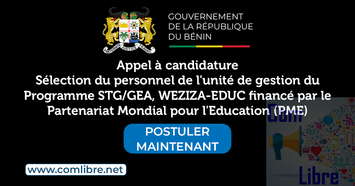 Dans le cadre de la mise en œuvre du Programme STG/GEA, WEZIZA-EDUC financé par le Partenariat Mondial pour l’Education (PME), le Gouvernement du Bénin lance le présent avis afin de recruter le personnel devant animer l’Unité de gestion dudit programme. A cet effet, les postes suivants sont à pouvoir :