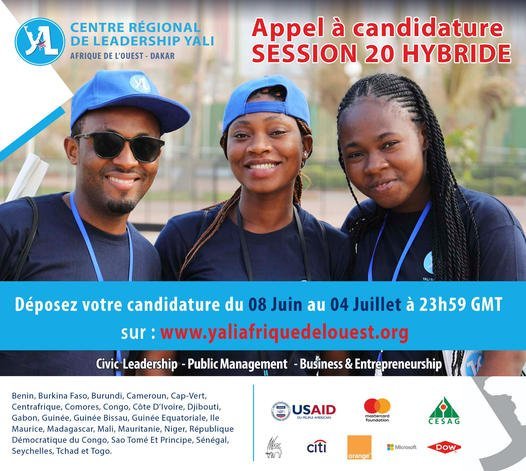 L’appel à candidature pour la session 20 hybride (2 semaines en ligne + 3 semaines en présentiel) du Centre Régional de Leadership YALI – Dakar a démarré le 08 juin et sera clôturé le 04 juillet 2022, à 23H59 GMT.
