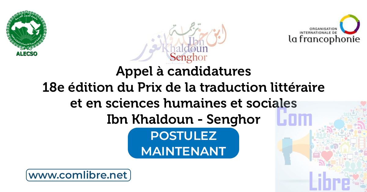 L’Organisation Internationale de la Francophonie (OIF) et l’Organisation Arabe pour l’Education, la Culture et les Sciences (ALECSO) annoncent l’ouverture des candidatures au Prix de la traduction Ibn Khaldoun et Léopold Sédar Senghor pour sa session 2025. Il récompense la traduction du français vers l’arabe et de l’arabe vers le français d’une œuvre littéraire et/ou en sciences humaines et sociales.
