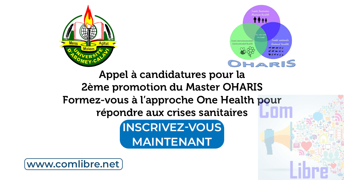 Les dossiers de candidatures peuvent être envoyés dès le 30 juin 2025 en un seul fichier pdf à l’adresse : info@oharis.net avec copie à : chakiraths@gmail.com, cyrilleboko@yahoo.fr, gnamac2017@gmail.com et déposés en version papier (obligatoire pour les candidats résidant au Bénin) au secrétariat scientifique du master OHARIS sis au bloc Acarologie de l’Unité de Recherche sur les Maladies Transmissibles de l’Ecole Polytechnique d’Abomey-Calavi et au plus tard le 15 Septembre 2025 à 18 h.
