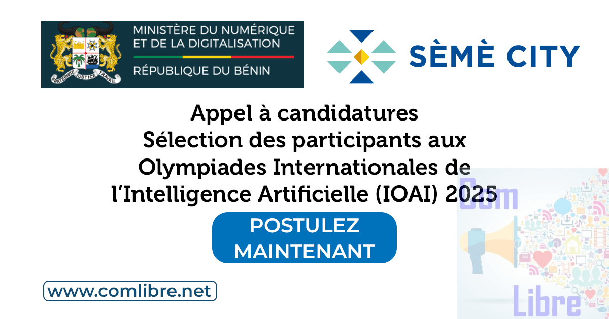 Le Ministère du Numérique et de la Digitalisation (MND), en collaboration avec le Ministère de l’Enseignement Supérieur et de la Recherche Scientifique (MESRS), le Ministère des Enseignements Secondaire, Technique et de la Formation Professionnelle (MESTFP) et l’Agence de Développement de Sèmè City (ADSC), annonce l’ouverture des candidatures pour la sélection des élèves qui représenteront le Bénin aux Olympiades Internationales de l’Intelligence Artificielle (IOAI) 2025.