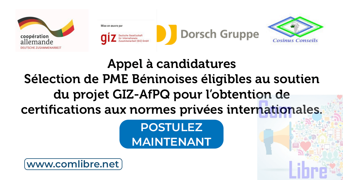 Dans le cadre de la mise en œuvre du projet Alliance for Product Quality in Africa (AfPQ) volet ZLECAF financé par la GIZ et qui vise à appuyer les entreprises (Petites et Moyennes Entreprises, PME) béninoises dans l’amélioration de la qualité de leurs produits en vue d’accroître leur compétitivité sur le marché international, le consortium DORSCH Impact-COSINUS, lance le présent appel à manifestation d’intérêt pour la sélection de PME désireuses de bénéficier d’un accompagnement pour l’obtention d’une certification à une norme privée internationale telle que entre autres :