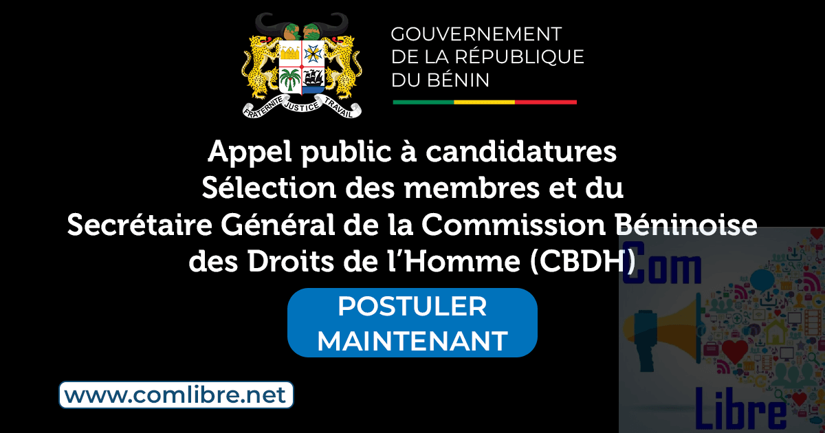 Dans le cadre de la mise en place de la Commission Béninoise des Droits de l’Homme (CBDH), instituée par la loi n° 2024-22 du 26 juillet 2024, le comité ad hoc de sélection, mis en place par arrêté 2024/N° 084/MJL/DC/SGM/SA du 27 novembre 2024, lance le présent appel public.
