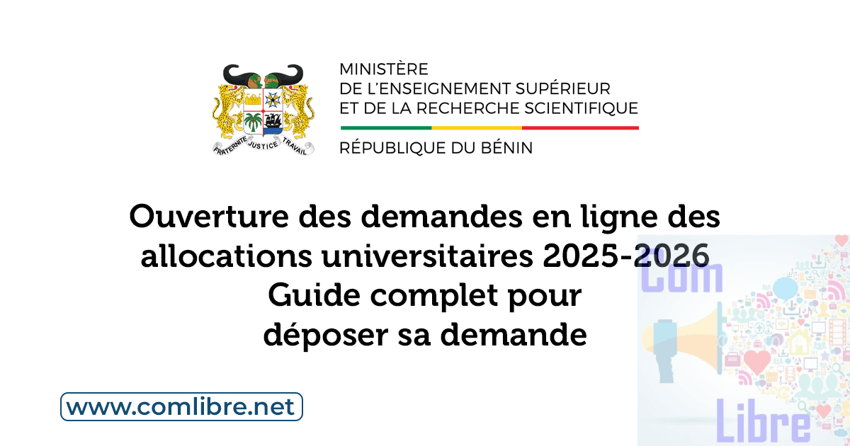 La Ministre de l’Enseignement supérieur et de la Recherche scientifique (MESRS) informe tous les étudiants allocataires des Universités Publiques du Bénin que le processus de demande en ligne des allocations d’études universitaires au titre de l’année académique 2025-2026 démarre le lundi 20 octobre 2025 à 00 heure et prendra rigoureusement fin le dimanche 8 février 2026 à minuit.