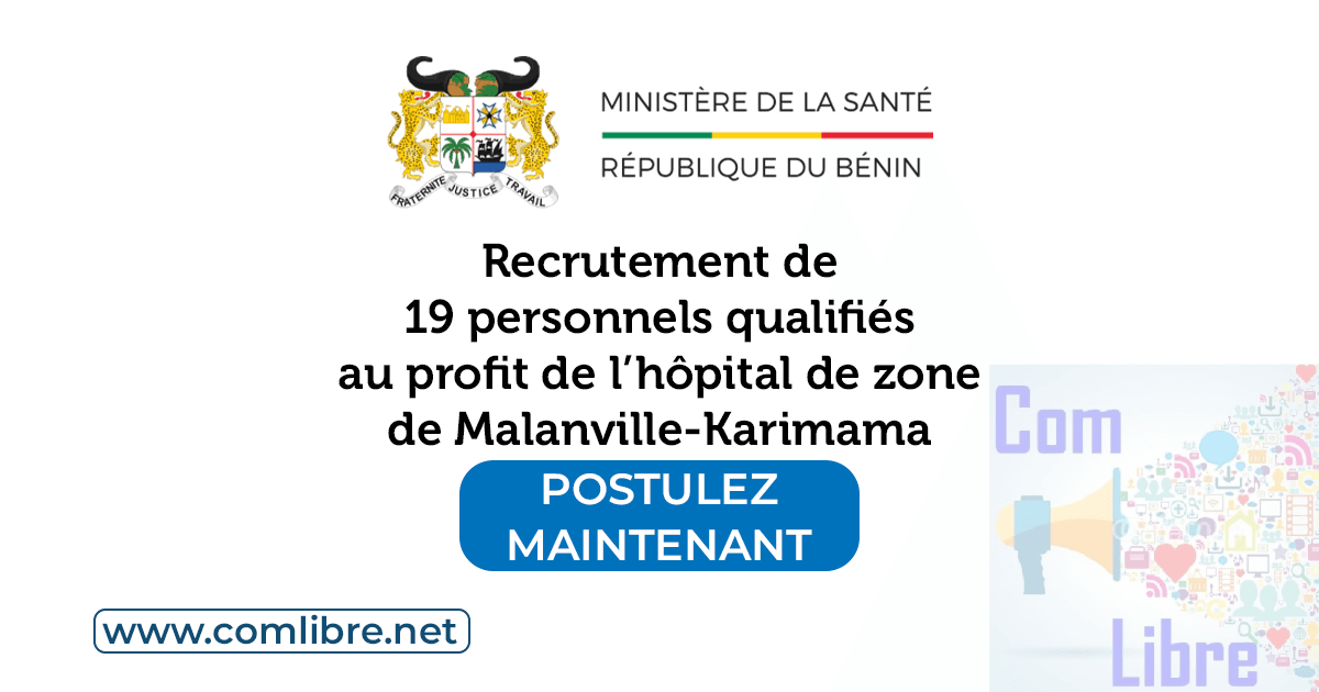 Dans le cadre du renforcement de l’effectif du personnel de l’hôpital de zone de Malanville-Karimama (HZ-MK), il est lancé un appel à candidature en vue du recrutement du personnel qualifié aux postes suivants :