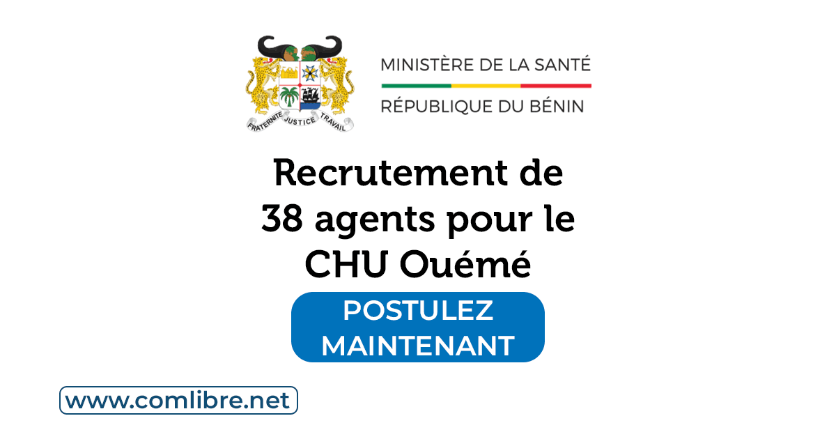 Dans le cadre du renforcement de ses capacités en ressources humaines de qualité, le Centre Hospitalier Universitaire Départemental (CHU) de l’Ouémé, lance le présent avis de recrutement de trente-huit (38) agents pour pourvoir aux postes ci-après :