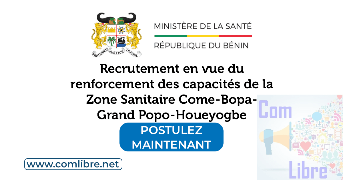 Le Ministère de la Santé de la République du Bénin, par le biais du Secrétariat Général du Ministère et de la Direction Départementale de la Santé du Mono, annonce un appel à candidatures pour la Zone Sanitaire Come-Bopa-Grand Popo-Houeyogbe. Cet avis de recrutement, daté du 18 août 2025, vise à renforcer les capacités de la zone sanitaire par l’embauche de soixante-six (66) agents tous corps confondus.