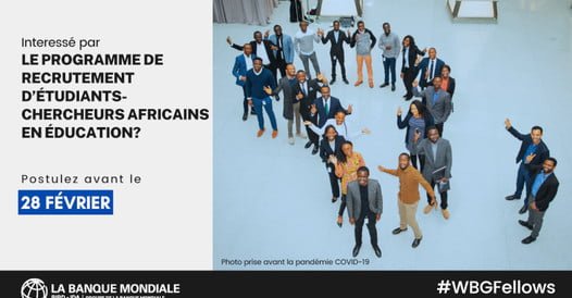 Le pôle mondial d’expertise en Éducation et le bureau de l’économiste en chef pour l’Afrique du Groupe de la Banque mondiale annoncent le lancement d’un programme de bourses pour le recrutement d’étudiants-chercheurs africains dans le secteur de l’éducation. Ce programme est ouvert aux titulaires d’un master, aux doctorants et aux docteurs récemment diplômés qui sont ressortissants d’un pays d’Afrique subsaharienne. Les candidatures féminines sont vivement encouragées, en particulier si elles concernent les technologies de l’éducation.