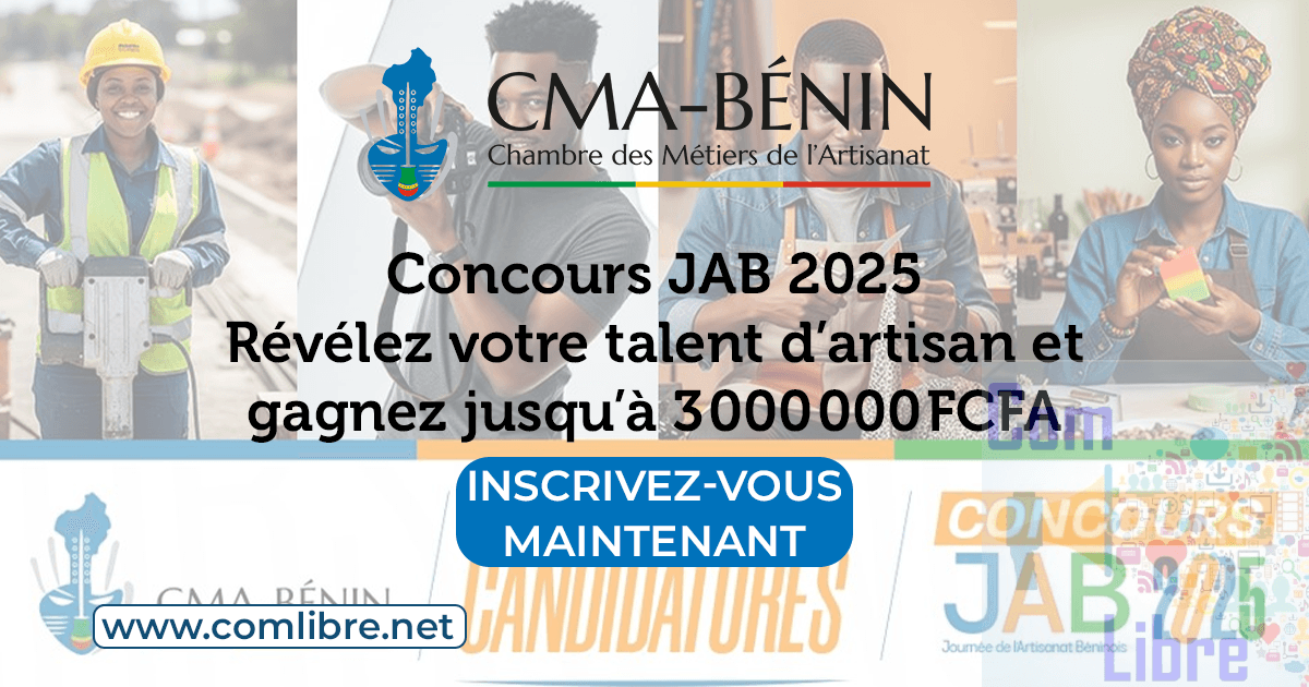 Dans le cadre de la célébration de la Journée de l’Artisan Béninois (JAB) – Édition 2025, placée sous le thème « Artisanat, créateur de richesses et d’emplois au Bénin : Défis et perspectives », la Chambre des Métiers de l’Artisanat du Bénin (CMABénin) a le plaisir de vous annoncer le lancement officiel de l’appel à candidatures pour le concours national de la JAB 2025.