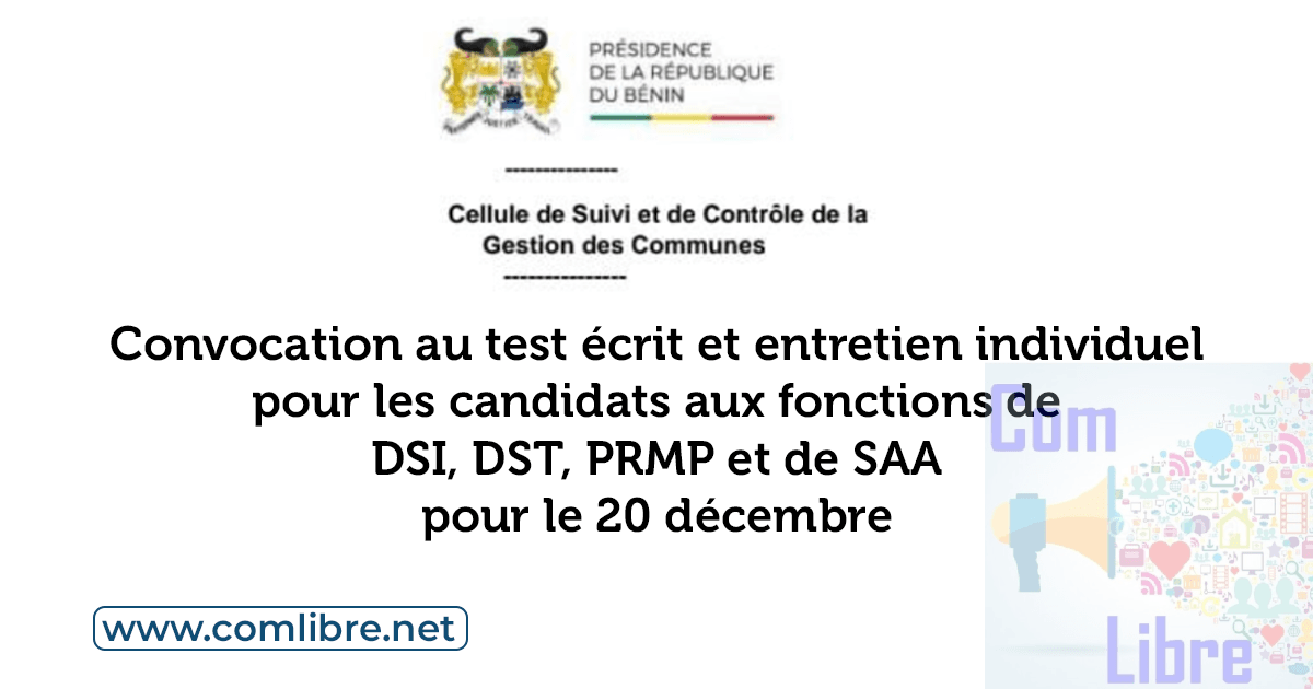 Le coordonnateur de la Cellule de suivi et de contrôle de la gestion des communes porte à la connaissance des candidats présélectionnés pour les fonctions de Directeur des systèmes d’information (DSI), Directeur des services techniques (DST), Personne responsable des marchés publics (PRMP) et de Secrétaire administratif d’arrondissement (SAA) ; que le test écrit à l’intention des SAA et l’entretien individuel devant un jury pour les profils DSI, DST et PRMP auront lieu le samedi 20 décembre 2025 au Collège d’enseignement général (CEG) Sainte Rita de Cotonou conformément aux mails envoyés aux candidats, à l’adresse indiquée par chacun.