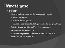- des vomissements de vieux sang digéré qui prend alors une couleur brunâtre (marc de café)