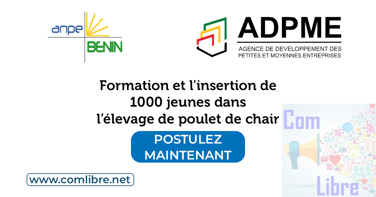 Le Gouvernement du Bénin, à travers l’Agence Nationale pour l’Emploi (ANPE) et l’Agence de Développement des Petites et Moyennes Entreprises (ADPME), lance un programme de formation et d’insertion professionnelle au profit de 1 000 jeunes dans le domaine de la production de poulets de chair.