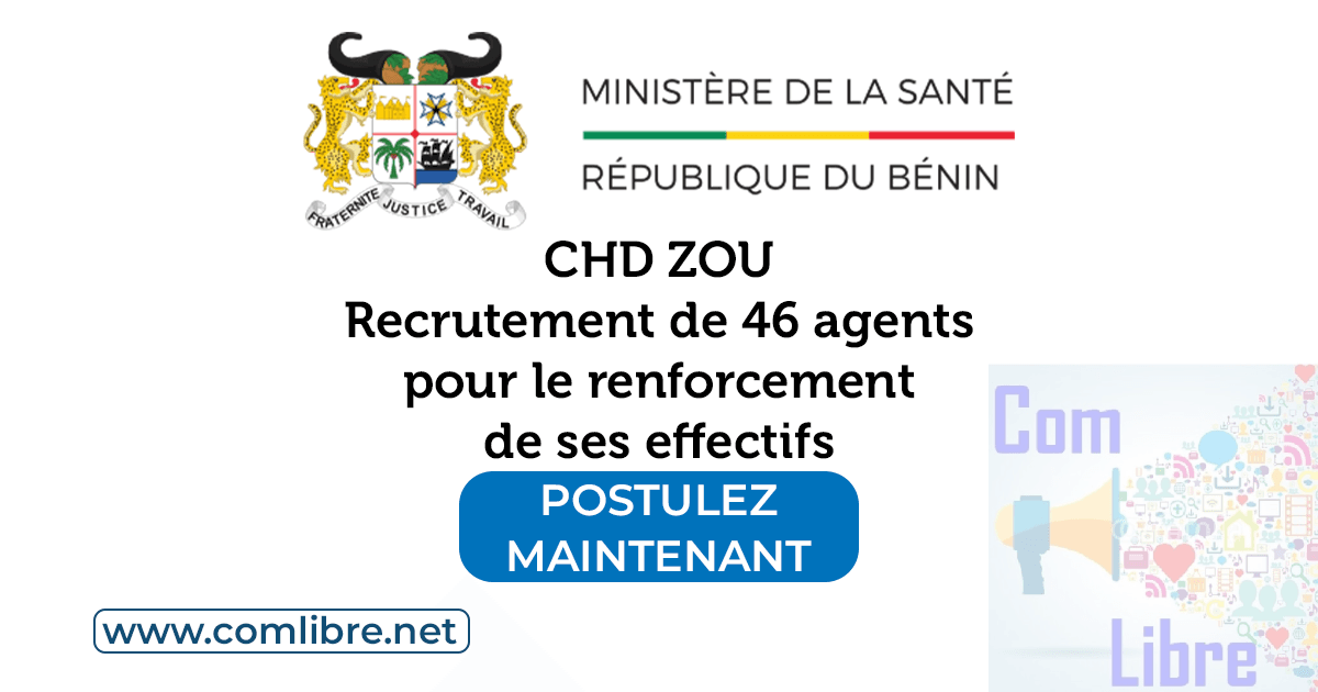 Dans le souci d’améliorer les conditions d’accueil des usagers, de réduire les délais d’attente, et d’optimiser la qualité de la prise en charge des patients, la Direction générale du Centre hospitalier départemental du Zou lance le présent avis de recrutement pour le renforcement de ses effectifs. À cet effet, il sera organisé un concours direct de recrutement de quarante-six (46) agents sur fonds propre, soumis au régime du code du travail.