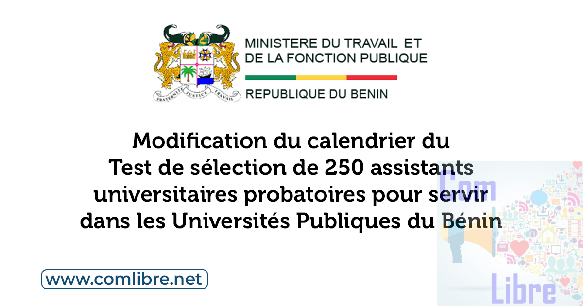 Le Ministère du Travail et de la Fonction Publique a récemment diffusé un communiqué important concernant le processus de sélection de deux cent cinquante (250) assistants en position probatoire destinés à servir dans les Universités Publiques du Bénin. Cette annonce vise à informer les candidats et le public des modifications apportées au calendrier initialement établi pour les différentes étapes de ce test très attendu.
