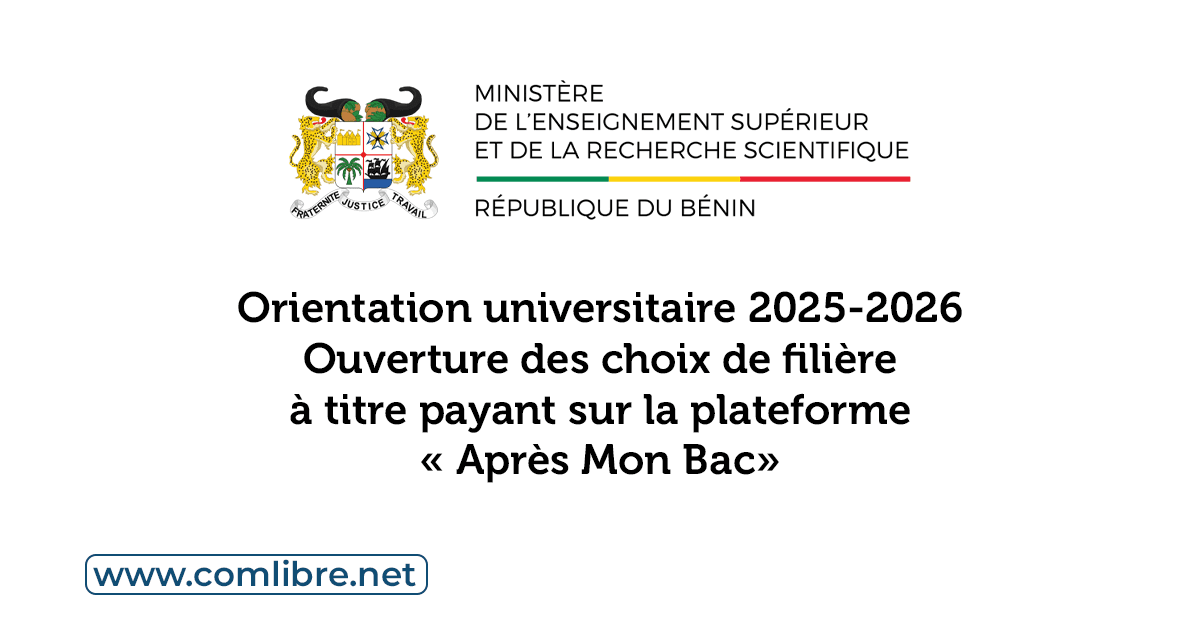 La Ministre de l’Enseignement Supérieur et de la Recherche Scientifique (MESRS) porte à la connaissance des nouveaux bacheliers que la plateforme de recueil des choix de filières en vue de leur sélection et de leur classement dans les universités publiques à titre entièrement payant, sera ouverte du lundi 22 septembre à 00 heure au dimanche 28 septembre 2025 à minuit pour les bacheliers de 2025, titulaires d’un baccalauréat classique (séries A1, A2, B, C, D, E, EA, F1, F2, F3, F4, G1, G2 et G3).