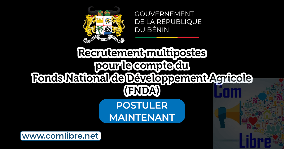 Dans le cadre de la mise en œuvre de la convention de partenariat entre l’Agence luxembourgeoise pour la Coopération au développement et le Fonds National de Développement Agricole (FNDA) relatif au projet BEN/005–Finance inclusive et innovante et BEN/005 • 24 3114 : Appui au FNDA pour faciliter le renforcement des capacités des SFD et des producteurs agricoles sur une durée de 24 mois d’une part, et du renforcement en ressources humaines de son équipe d’autre part, le FNDA a prévu le recrutement aux postes ci-après :