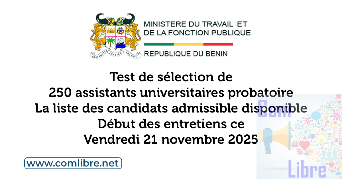 Les candidats admissibles, tous domaines scientifiques confondus, sont invités à prendre part à la phase d’entretien qui débutera le vendredi 21 novembre 2025 à partir de 7 heures au Lycée Technique F.M. Coulibaly de Cotonou.