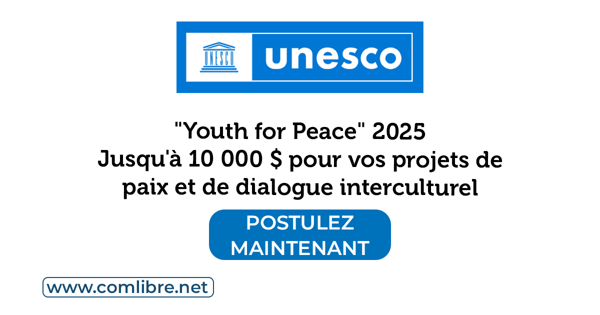 - Avril 2026 : Participez au Dialogue mondial des jeunes leaders pour la paix de l’UNESCO en personne à Guangzhou, en Chine, avec des présentations de projets, un dialogue avec des dirigeants de haut niveau et le lancement du Réseau mondial des anciens.